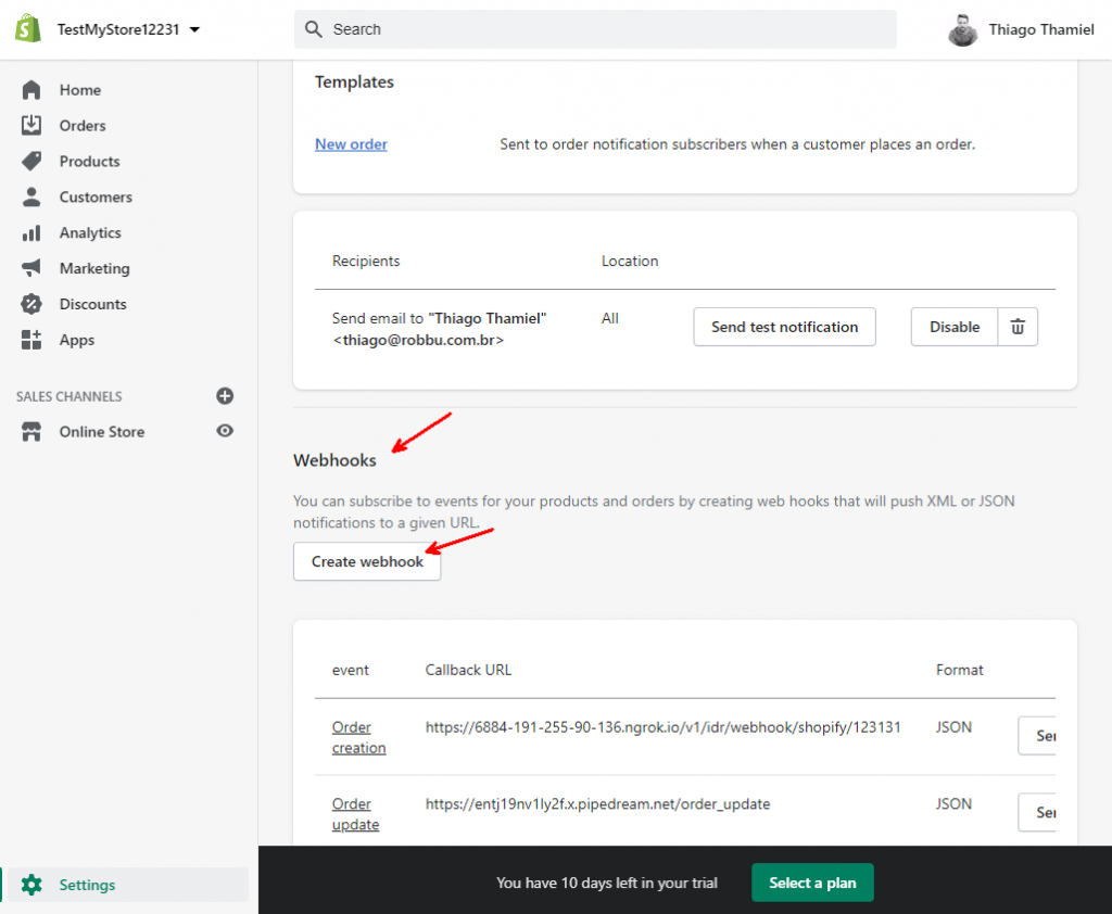 Em seguida, você será levado para a página de notificação; nessa página, procure a opção Webhooks e clique em Criar webhook: