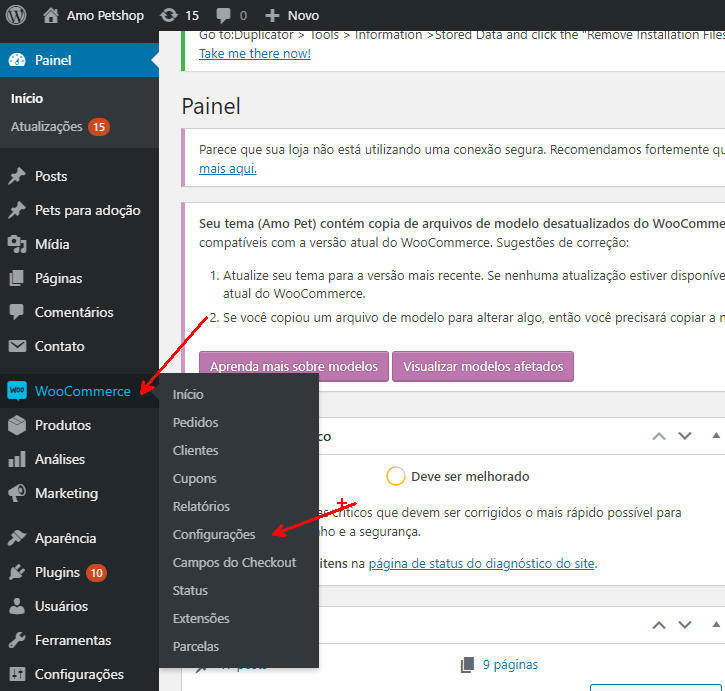 Acesse o painel principal da sua loja e procure a opção WooCommerce. Nela, clique em Configurações: