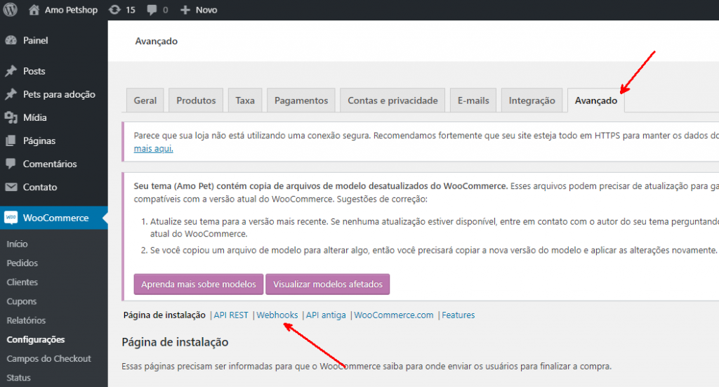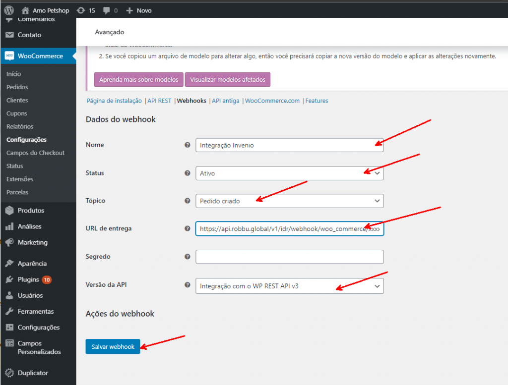 No canto superior desta tela, tem a opção Avançado. Clique sobre ela e, então, aparecerão outros campos de configuração, como ilustrado abaixo e depois clique em Webhook.