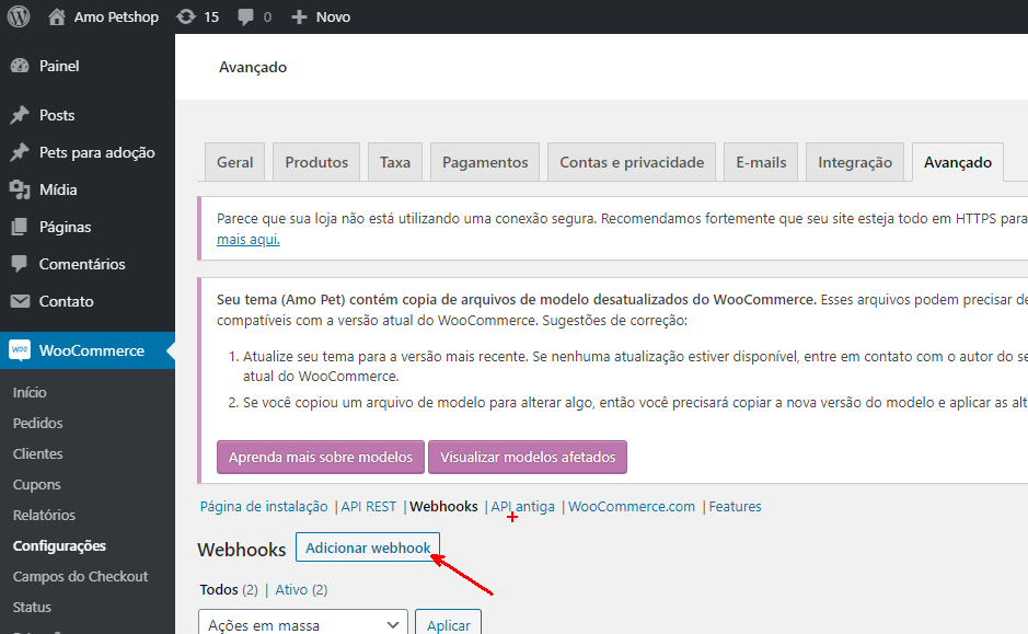 Aparecerão as opções de webhook, clique sobre Adicionar webhook: