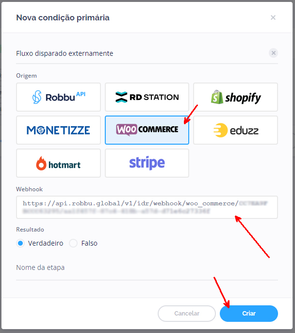 Agora, escolha a integração “WooCommerce” e clique no “webhook” para copiar a URL. Após salvar o endereço do seu Webhook, clique em “Criar”.