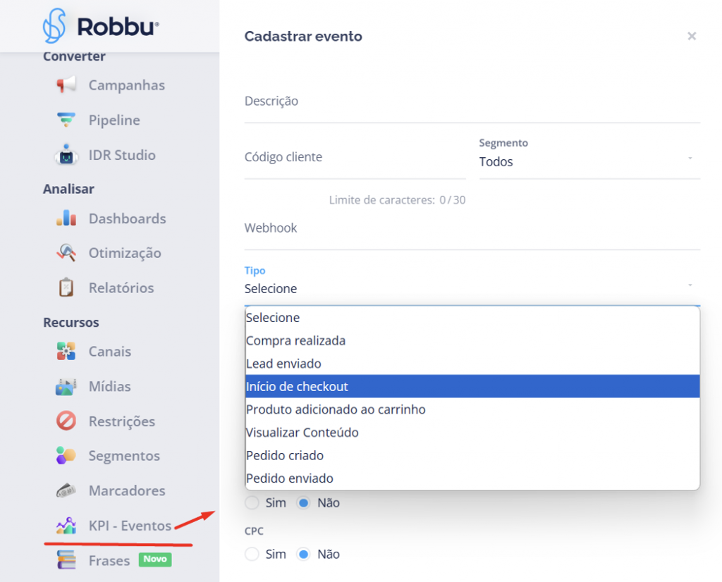 Em KPI – Eventos, cadastre um novo evento e escolha um “Tipo” especifico relacionado: