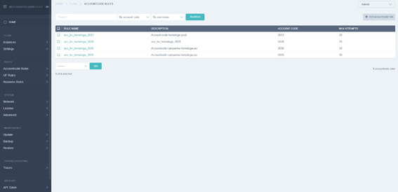 Para criar uma regra limitando a quantidade máxima de tentativas de ligações por campanha, é necessário configurá-la no formulário “ACCOUNTCODE RULES”, onde é possível delimitar a quantidade máxima de tentativas por telefone que o discador será acionado em campanhas pré-definidas.