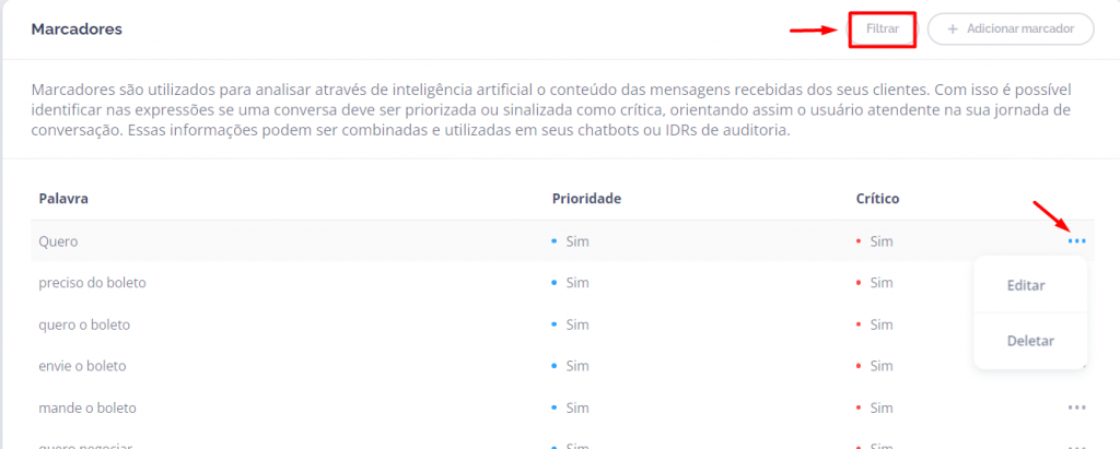 Utilize os botões Filtrar para encontrar palavras/frases já cadastradas e, ao clicar os três pontinhos ao final da linha de um marcador, é possível editar ou deletar marcadores desejados.