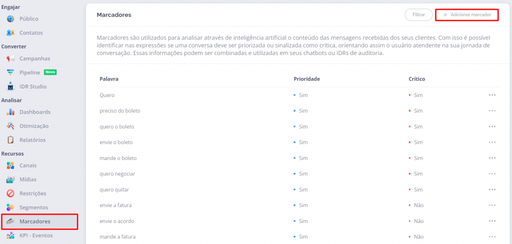Marcadores são palavras ou frases que podem ser definidas com parâmetros para alterar a prioridade e/ou criticidade de um contato.