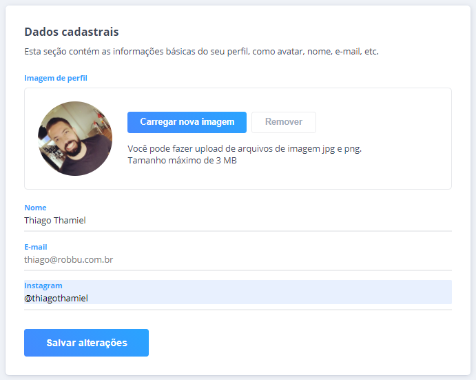 Você pode alterar o seu nome, senha, imagem do avatar e sua conta do Instagram.