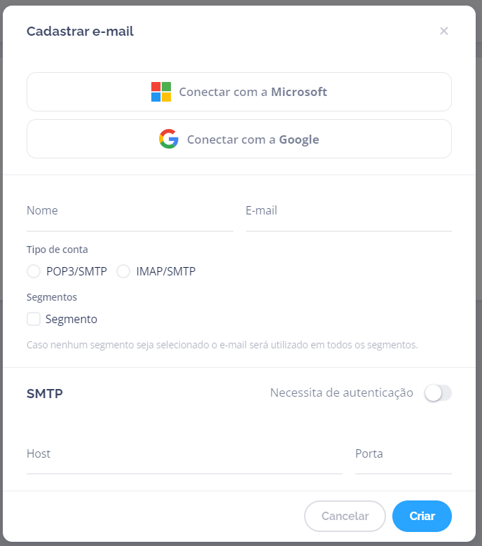 A integração padrão via IMAP/POP do Google foi descontinuada. Portanto, a partir de agora, as caixas de e-mail via Google/Gmail precisarão ser conectadas através do botão <Conectar com o Google>.
