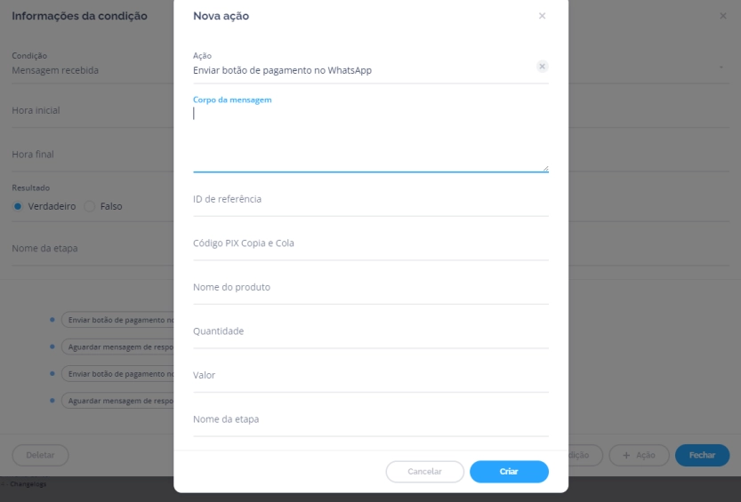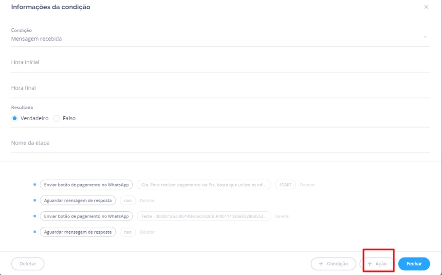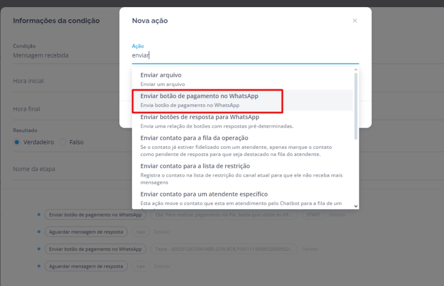3. Incluir nova ação (Enviar botão de pagamento no WhatsApp)