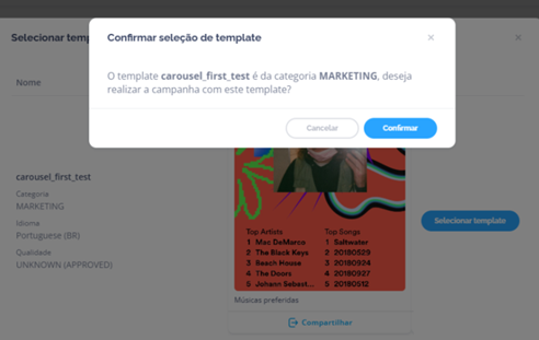 Na tela de campanhas: ao selecionar um template do tipo Marketing, será aberta uma caixa de confirmação com a seguinte mensagem: