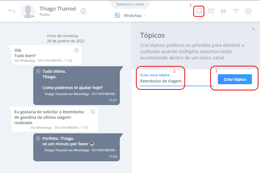 Clique no ícone do menu superior direito de uma conversa (1), conforme imagem abaixo, informe um nome para o seu tópico (2) e clique no botão “Criar tópico”(3).