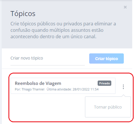 Por padrão, um tópico é do tipo “Privado”, e os tópicos privados são utilizados para comunicação interna ou anotações, visíveis para todos os usuários da plataforma.
