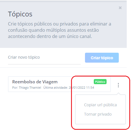 Após tornar um tópico publico, clique no ícone do lado direito e escolha a opção “Copiar url pública”. A URL do tópico será copiado para sua área de transferência (CTRL+C), e você pode enviar para o cliente utilizando o canal atual de comunicação ou por um dos canais disponíveis na sua plataforma, como SMS, e-mail, WhatsApp…
