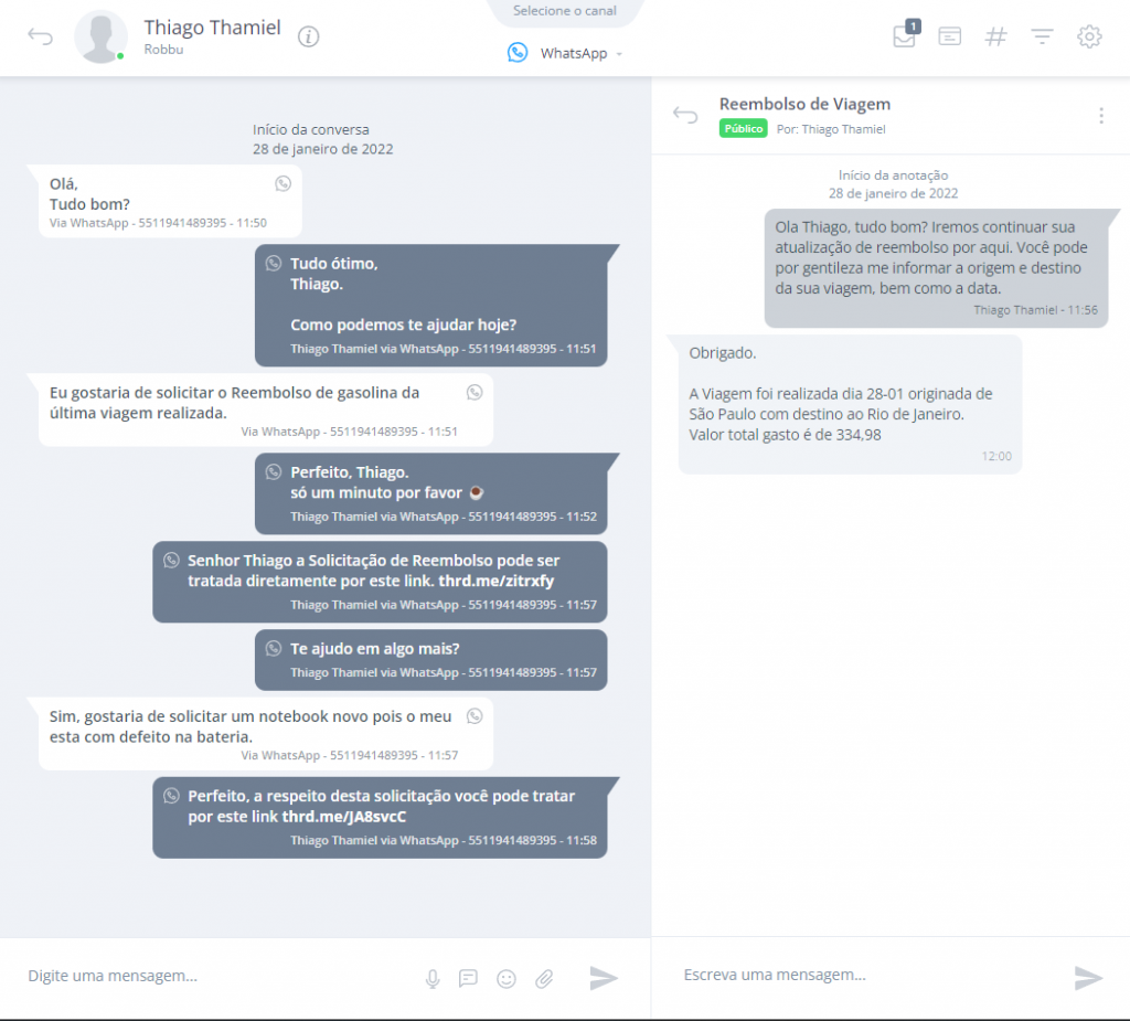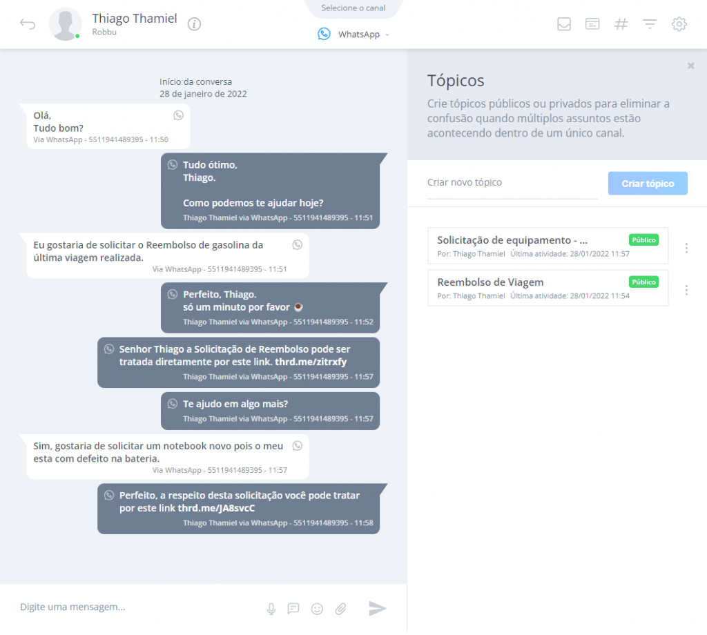 Ao clicar no tópico, será aberta a tela de conversa. Aqui você pode conversar com o cliente normalmente pelo tempo que for necessário.