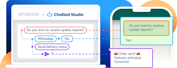 With our bot builder, you control what happens with every interaction. You can also create automations involving the systems you use by integrating APIs with Invenio.